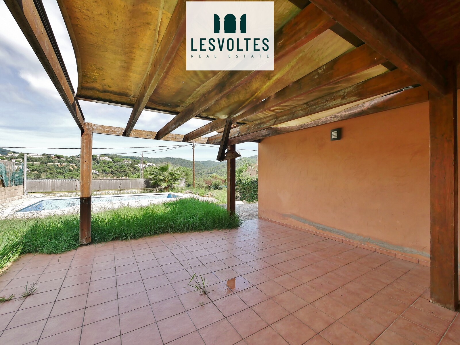 El exterior dispone de varias zonas de terraza, patio y jardín, así como de una piscina que requiere remodelación.